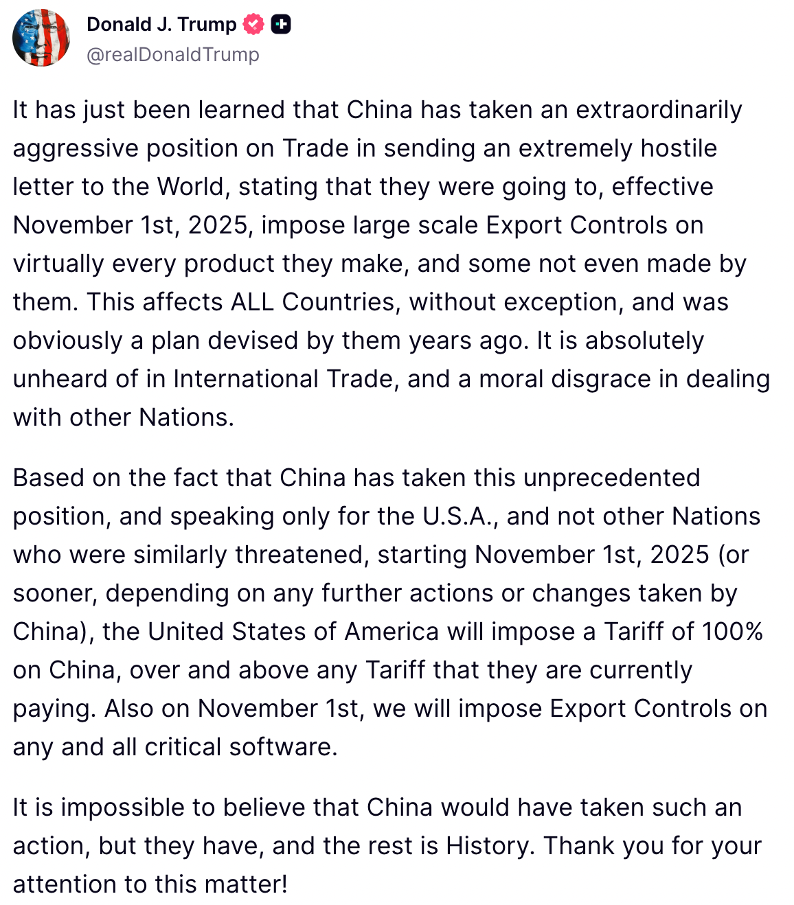 This post from Trump about tariffs with China: