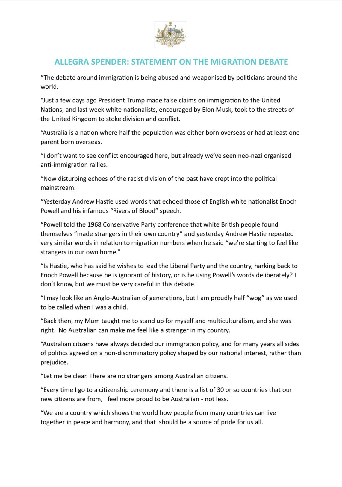 Allegra Spender told us all how she feels about mass immigration last week, in a lengthy post on Twitter where she proclaimed Australians have always had a say in our immigration policy and that it was inflammatory to say we were becoming ‘strangers in our own home’.